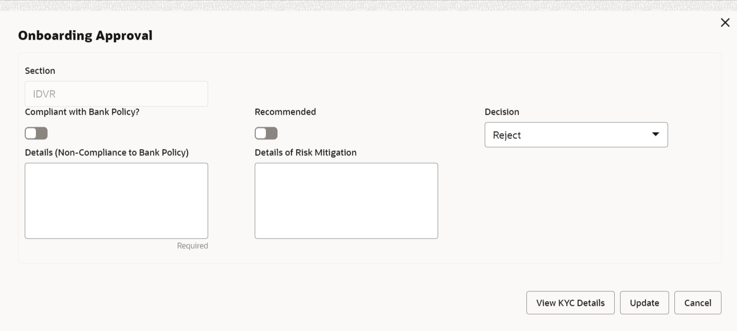 Compliant with Bank Policy Select the toggle button if customer is compliant with the Bank Policy.