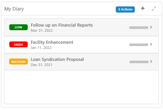 The relationship managers can add entries or the tasks that they need to perform in near future. The relationship manager can also assign priorities to the tasks, set a due date, and status for the task in this widget.