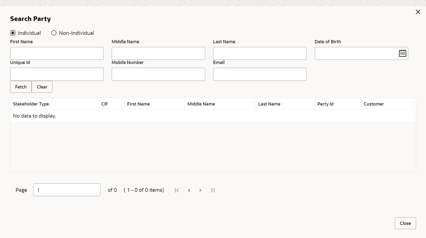 If CIF/Party Id is not known, click the search icon to launch the Search Party screen and select from the list of values.The Search Party - Individual screen displays.The Search Party - Non Individual screen displays. - If the Stakeholder is New to the bank, perform the following steps: