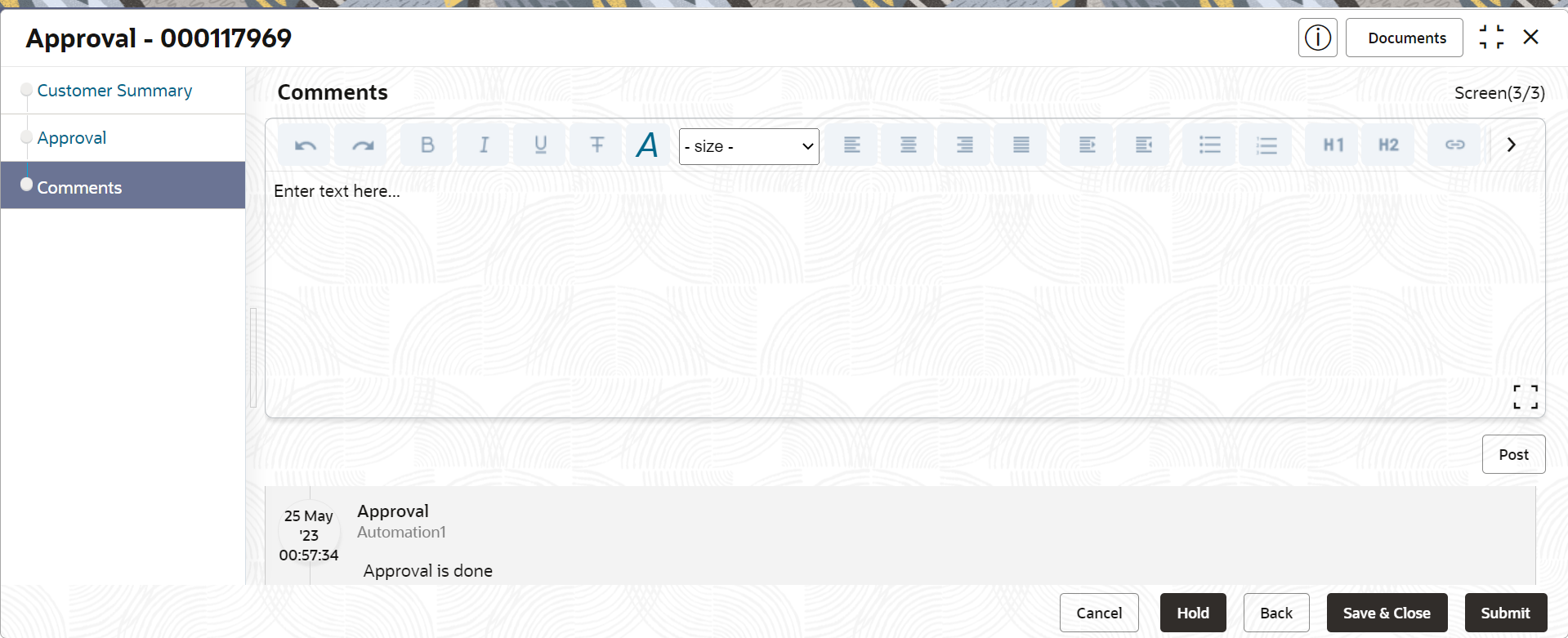 The Approval – Comments screen displays.