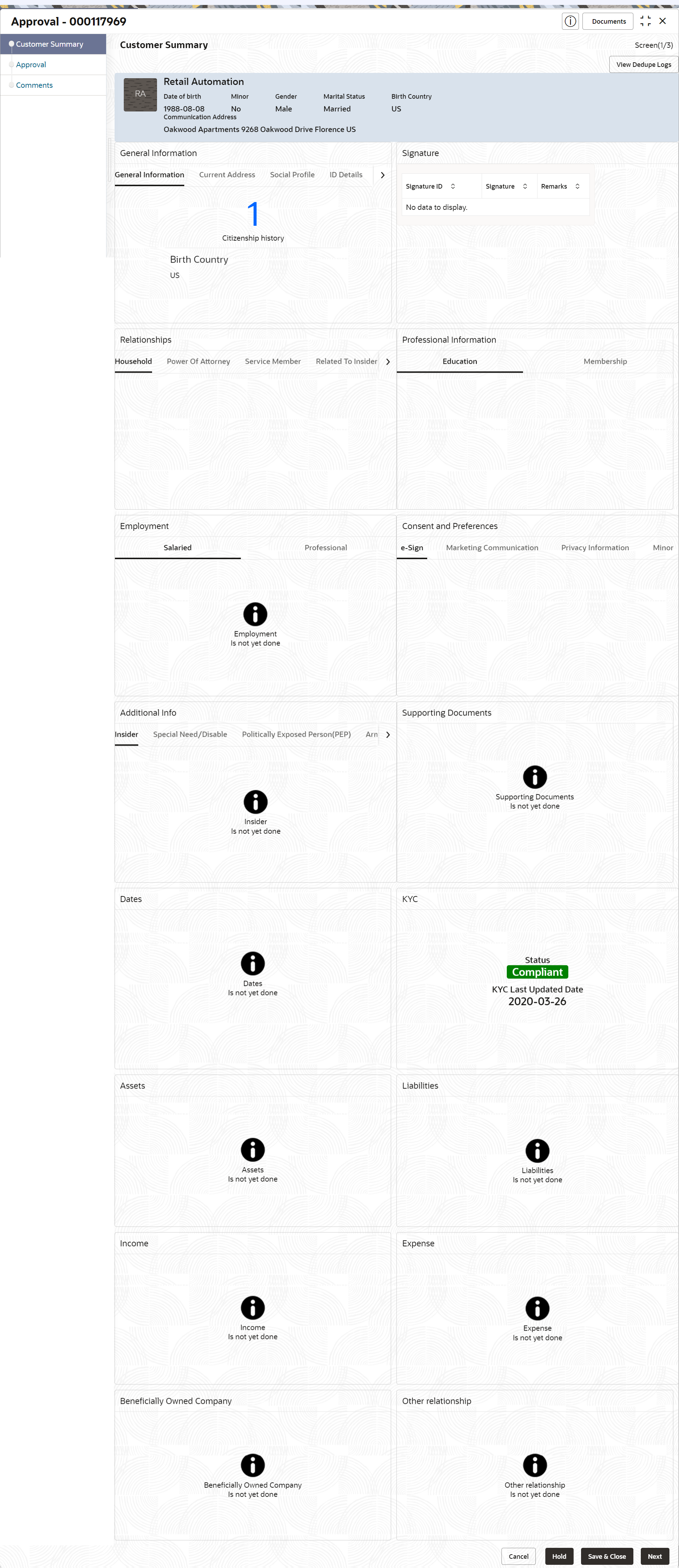 2. On the Customer Summary screen, verify the details that are displayed in tiles. For more information on tiles, refer to Table 1-19.