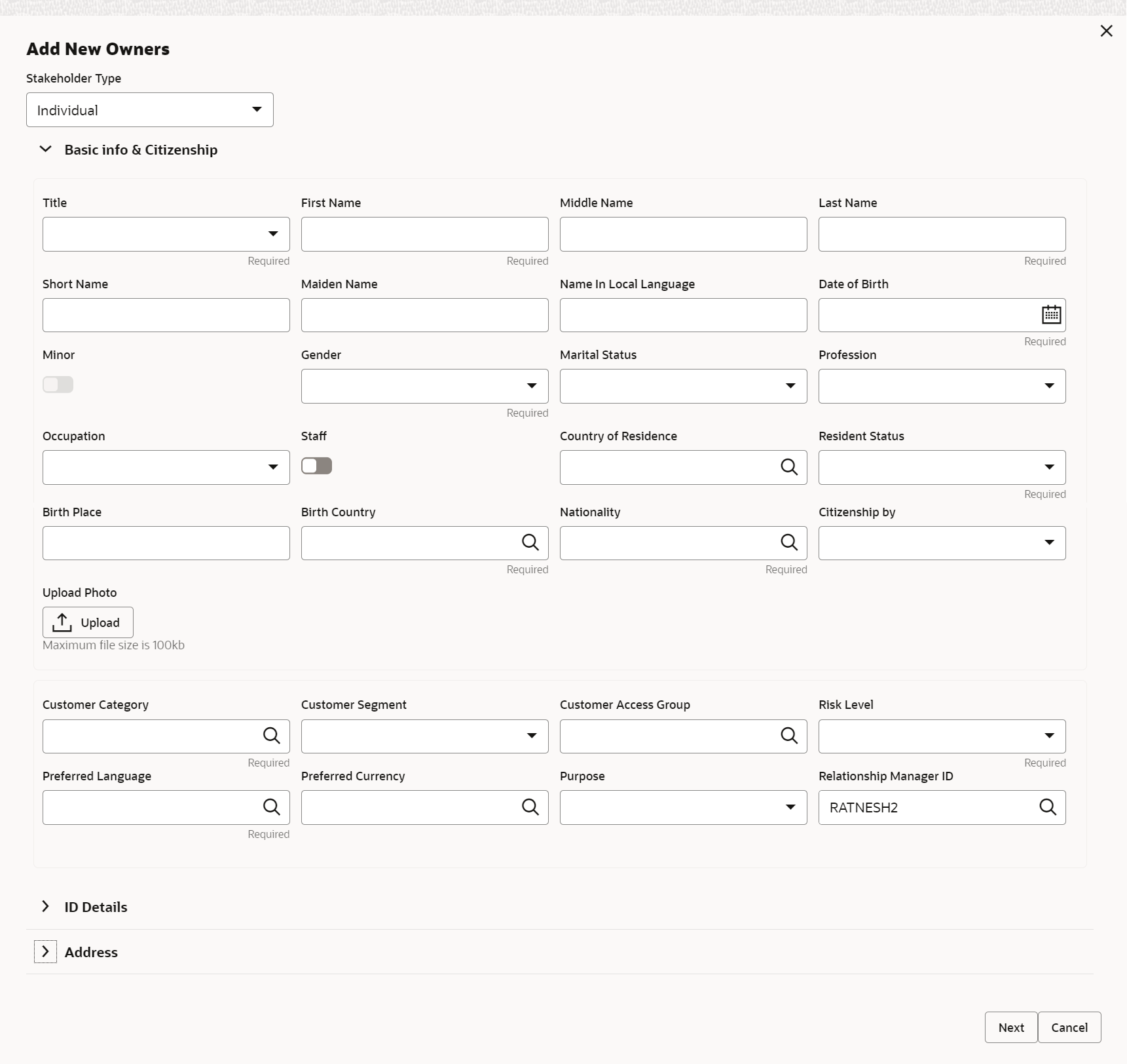 User should have required access to onboarding a party within a customer access group. For more details, refer to Oracle Banking Party Configuration User Guide.ID Type Select the ID type from the drop-down list. Unique ID Specify the unique ID of the new stakeholder. Upload Photo Upload the photo of the new stakeholder. Birth Country Click the search icon and select the birth country from the list. Nationality Click the search icon and select the nationality of the stakeholder from the list. Citizenship By Select the ‘Citizenship By’ from the drop-down list. Residential Status Select the residential status from the drop-down list. Country of Residence Click the search icon and select the country from the list. Preferred Language Select the preferred language from the drop-down list. Preferred Currency Click the search icon and select a preferred currency from the list. Address Specify the fields under this segment. Address Type Select the address type from the drop-down list. Building Name Specify the building name of the new stakeholder. Street Name Specify the street name of the new stakeholder. Locality Specify the locality of the new stakeholder. City Specify the city of the new stakeholder. State Specify the state of the new stakeholder. Country Code Click the search icon and select country code from the list. Zip Code Specify the zip code of the address. Mobile Number Specify the mobile number of the new stakeholder. Email ID Specify the email Id of the new stakeholder. Contact Number Specify the contact number of the new stakeholder. Narrative Specify the description for the new stakeholder. - Click Next to capture the KYC details for the