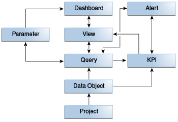 Some aspects of building projects are always bottom-up. You must create your project and add data objects to it first. You cannot configure a query or a realtime KPI before you add a data object. Likewise, you cannot configure a scheduled KPI before you create the query on which it is based. You cannot create a KPI from a view. You cannot create a parameter from a dashboard.