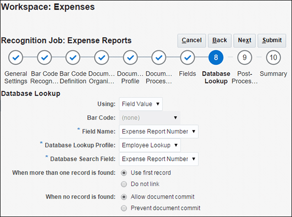 A Recognition Processor job organizes the batch into individual expense documents based on expense cover sheets it detects. It then assigns the bar code’s value (in this case, an expense report number) to a required Capture metadata field, and that value is used to look up and populate remaining metadata fields.