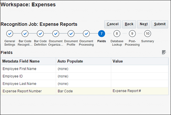 The Recognition Processor job separated the single document into individual documents based on the page separator you configured in Task 8: Configure Recognition Processing. In addition, the job populated the Expense Report Number metadata field with the bar code value it read, as configured. Lastly, the job performed a database lookup and populated the remaining metadata fields using the database lookup return fields (if configured).