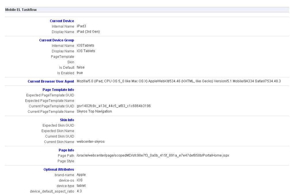 Expression Language expressions can be used to return device attributes. Sample code that can be used for this purpose is presented in EL Expressions Related to Device Settings in Developing for Oracle WebCenter Portal. A developer can use this code to create a task flow that returns device information that can be useful in troubleshooting a problem with the way a portal renders on a given device. Figure 10 shows the output from a task flow created with this sample code.