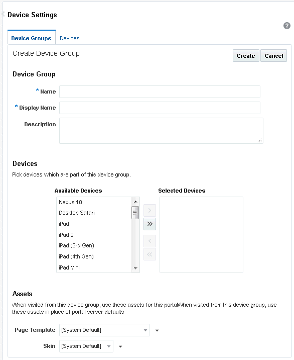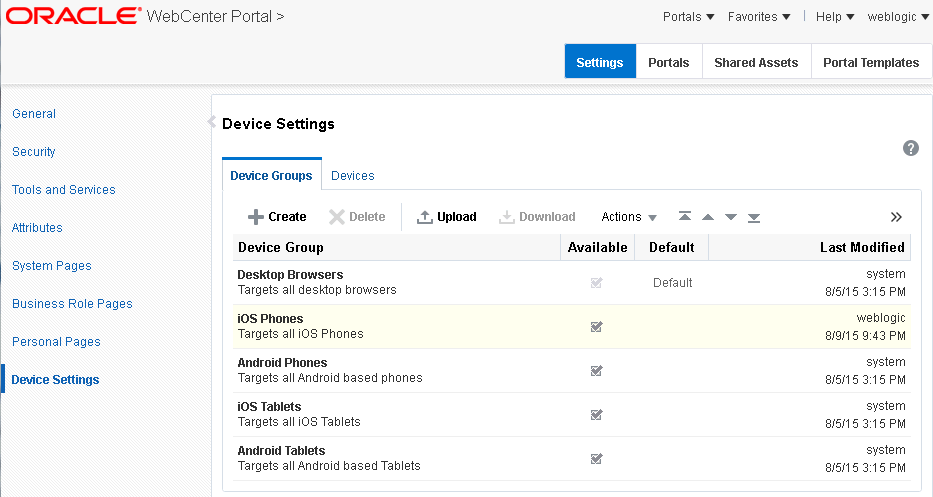 A device group represents a collection of devices that share similar display requirements. Out-of-the-box, WebCenter Portal comes with several pre-configured device groups: Desktop Browsers, iOS Phones, Android Phones, iOS Tablets, and Android Tablets.