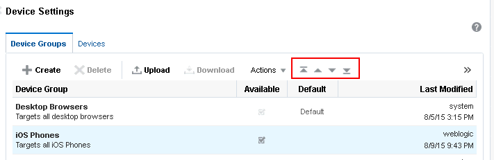 When a user accesses WebCenter Portal using a device, portals are rendered using the assets like page template and skin associated with the device group to which that device belongs. However, a device may be associated with multiple device groups. In such cases, the ordering of the device groups in the Device Groups tab determines the precedence of device groups.