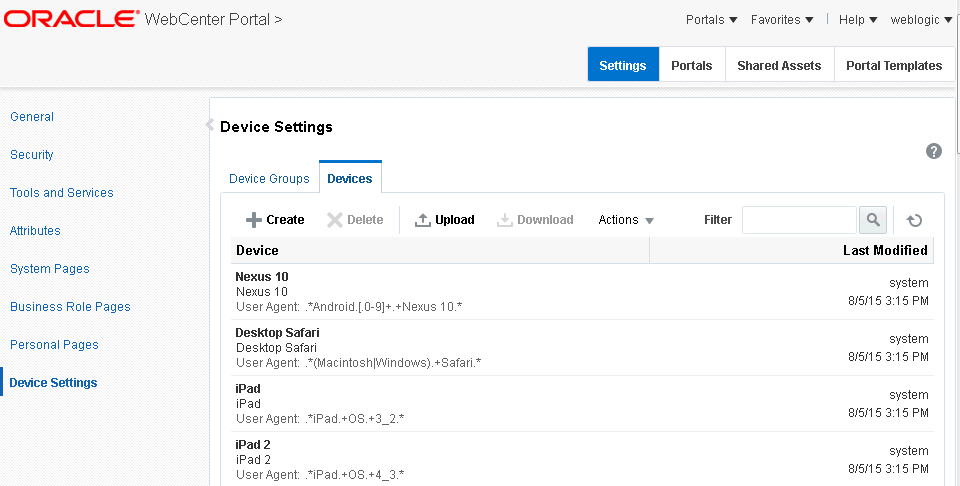 Use the Device Settings page in WebCenter Portal Administration to control how portals render on different kinds of devices including desktop browsers, smart phones, and tablets.