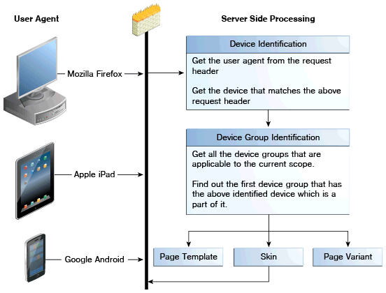 As Figure 3 shows, when a request comes in to the server, the user agent string is examined in the header of the request. Next, WebCenter Portal looks for a device that matches that user agent (a regular expression string).