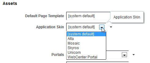 Note: If the desired skin does not appear in the Application Skin list, its Available option may be deselected. See Managing a Skin in Building Portals with Oracle WebCenter Portal.