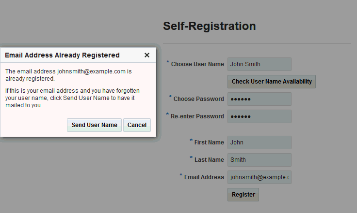 The self-registration page provided with WebCenter Portal offers to send a user name reminder mail message to anyone who tries to register with an email address that has already been used (Figure 25).