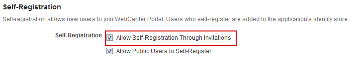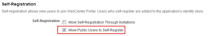 When you deselect this option, public users cannot self-register with WebCenter Portal. If you want to enable self-registration on an invitation-only basis, see Enabling Self-Registration By Invitation-Only.