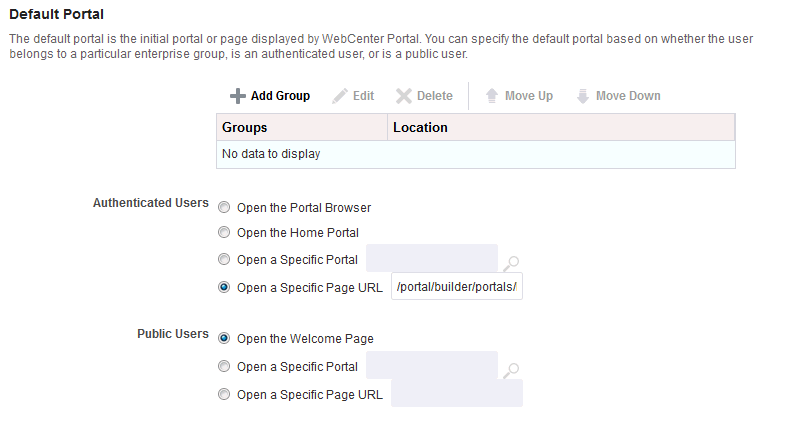 Users who self-register are added directly to the WebCenter Portal identity store and assigned the Authenticated-User role. By default, users with Authenticated-User role have access to the Home portal, pages that they create, and public pages. They are also allowed to view public portals, join any portal that allows self-subscription, and create portals of their own. If you enable self-registration, consider modifying Authenticated-User permissions to suit your exact requirements. See Modifying Application Role Permissions.