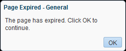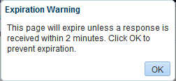 Display Timeout Popup. Select to display an Expiration Warning notification popup when the Session Timeout value is reached. The user can click OK within 2 minutes to prevent the timeout. If the user does not respond to the Expiration Warning within 2 minutes, then the session times out. In the Timeout notification popup, the user can click OK to log in again and restart at the page that was active when the session expired.