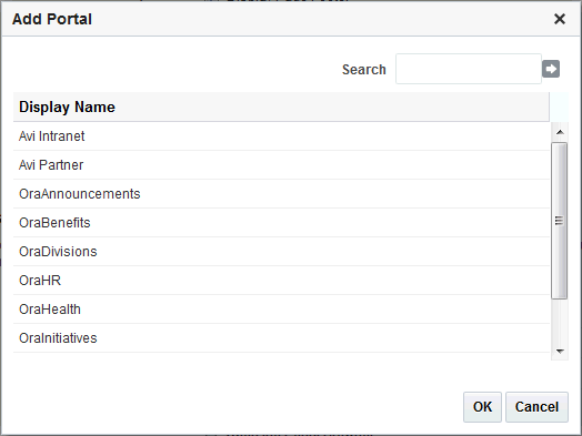 http://host:port/webcenter/portal/portalNameOr click Browse to select from a list of portals. Select an option from the Add Portal list, and click OK, or enter the portal name in the Search field and click Search.
