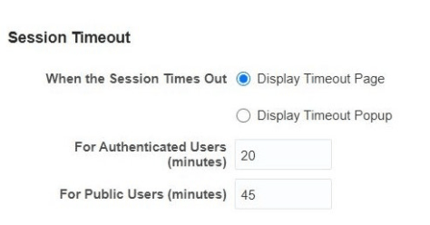 In the For Public Users (minutes) field, enter a new value. When the session timeout value for Public User is reached, the expiration warning notification popup is displayed. The user can click OK within 2 minutes to prevent the timeout. If the user does not respond to the Expiration Warning within 2 minutes, then the session times out. In the Timeout notification popup, the user can click OK to trigger the page refresh and extends the session by the value specified in minutes. After the refresh, the user continues to remain on the same page.