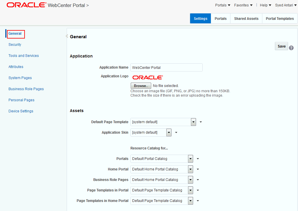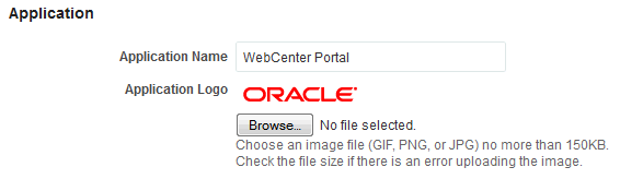 Note: The changes you make to the Application Name and Application Logo on the General page in WebCenter Portal Administration will only affect pages in the Home portal. They will not affect the other WebCenter Portal Administration pages. To change the logo on portal pages, see Changing the Portal Icon and Changing the Portal Logo in Building Portals with Oracle WebCenter Portal.