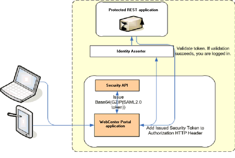 Although WebCenter Portal and other Oracle WebLogic applications can use REST APIs to display information the way they need to, since such calls originate from the mid-tier, users will be prompted again to provide login credentials. To overcome this, we use perimeter authentication where the user identity is propagated in the HTTP header and asserted using the OPSS Trust Service Asserter.