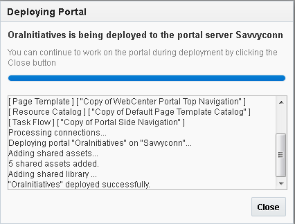 The Deploy Portals dialog displays the progress and status of portal deployment. While the portal is being deployed, you can choose to close the dialog and continue to work on the portal if required.