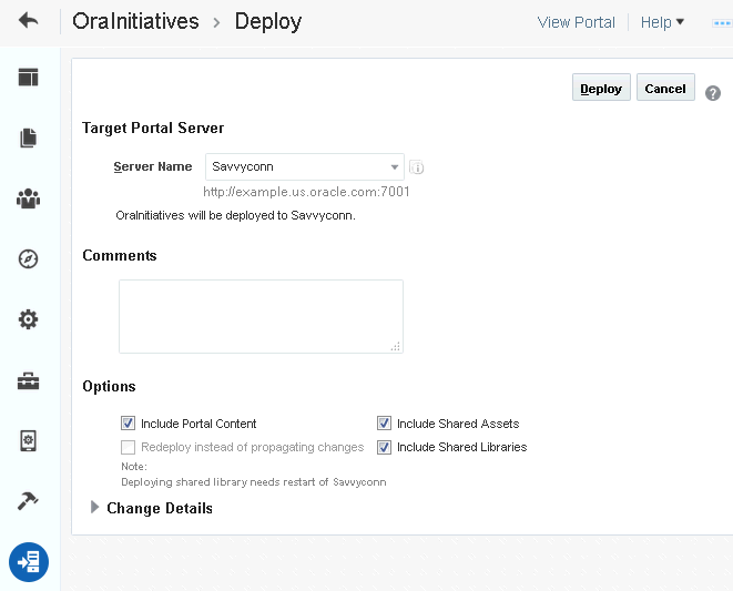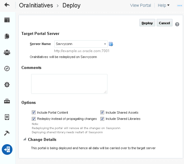 If this is the first time the portal is being deployed, the Redeploy instead of propagating changes check box appears disabled. Expanding the Change Details section displays a message that the portal is being deployed (for the first time) and hence all the data will be carried over to the target server. When you propagate a portal, this section displays the changes made to the portal since the last deployment.