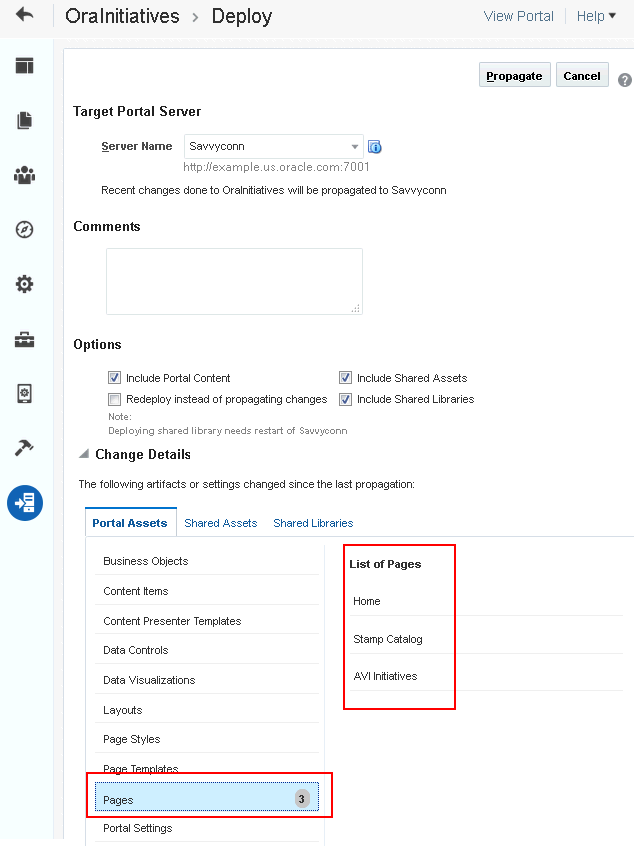 Administrators can propagate portal changes made in staging to production if the stage and production environments are connected and kept “in sync”. For example, you can propagate portal changes such as new pages and assets added or modified. Oracle strongly recommends that you always make changes in stage first and then push your portal changes to production using deployment or propagation. Propagation does not require the production server to be restarted or incur any downtime.