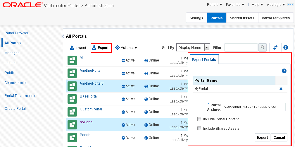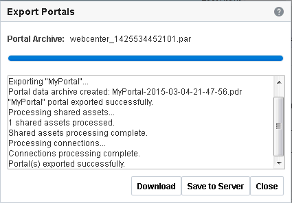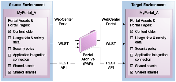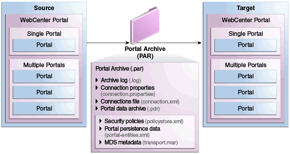.parfile) of the source portal and import the archived portal on the target server by using WebCenter Portal Administration. You can also use WLST commands to export portals to an archive and then import portals from the file.For details, see Exporting and Importing Portal Archives.