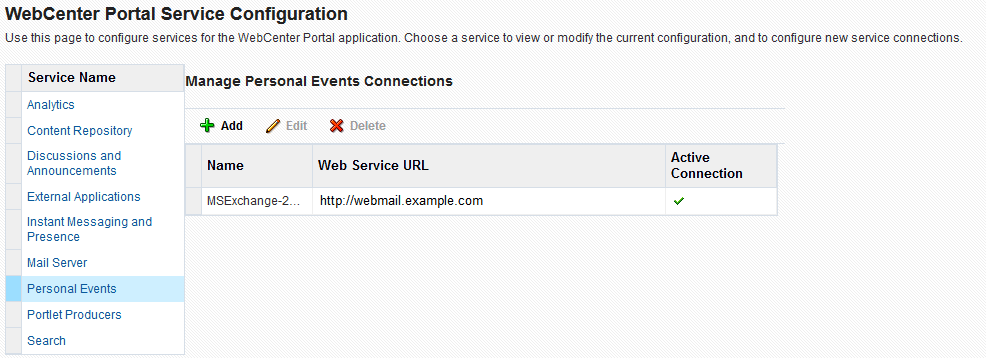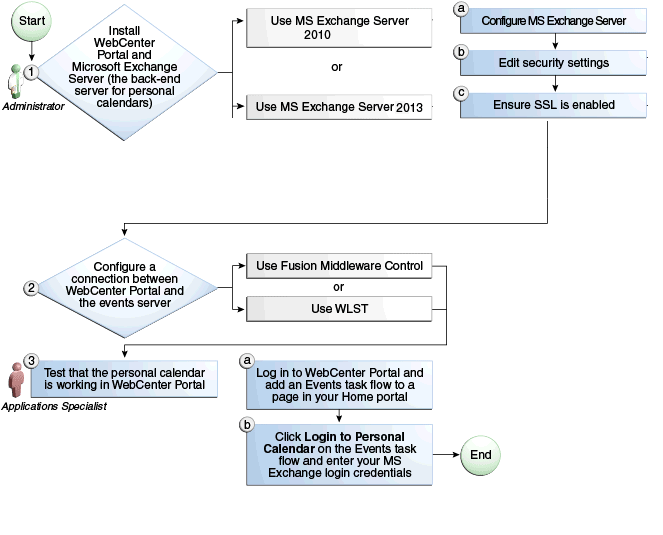 Personal calendars are available through a Microsoft Exchange Server; therefore, a connection to that server is required. You can register the Microsoft Exchange Server connection through the Fusion Middleware Control Console or using WLST.