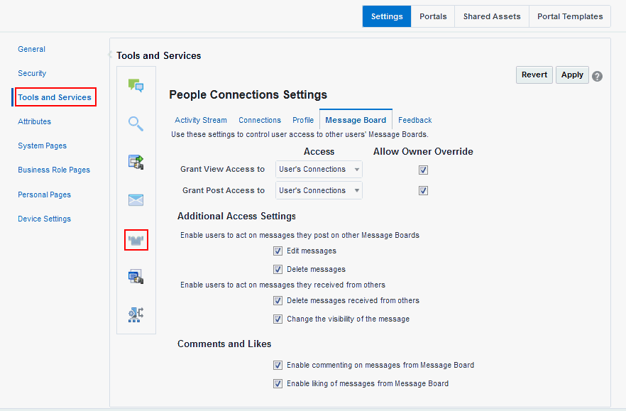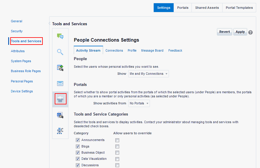 On the Settings page (see Accessing the Settings Pages in WebCenter Portal Administration), click Tools and Services.