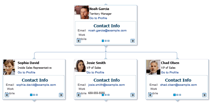 The Organization View task flow and the Organization tab on a Profile page can provide a visualization of your management chain, for example, they can render a view of a manager and the manager’s direct reports.
