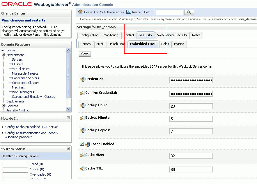 wc_domain), then open the Security tab and then the Embedded LDAP subtab (Figure 7).
