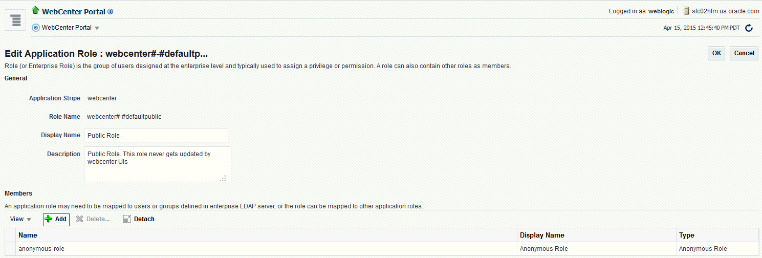 weblogicrole from the Edit Application Role page, select the role and click Delete, then click Yes on the confirmation dialog. -