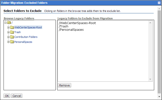 In the Folder Migration: Excluded Folders dialog, ensure that all folders other than the WebCenter Portal root folder appear in the Legacy Folders to Exclude from Migration box. In Figure 7,