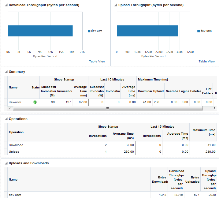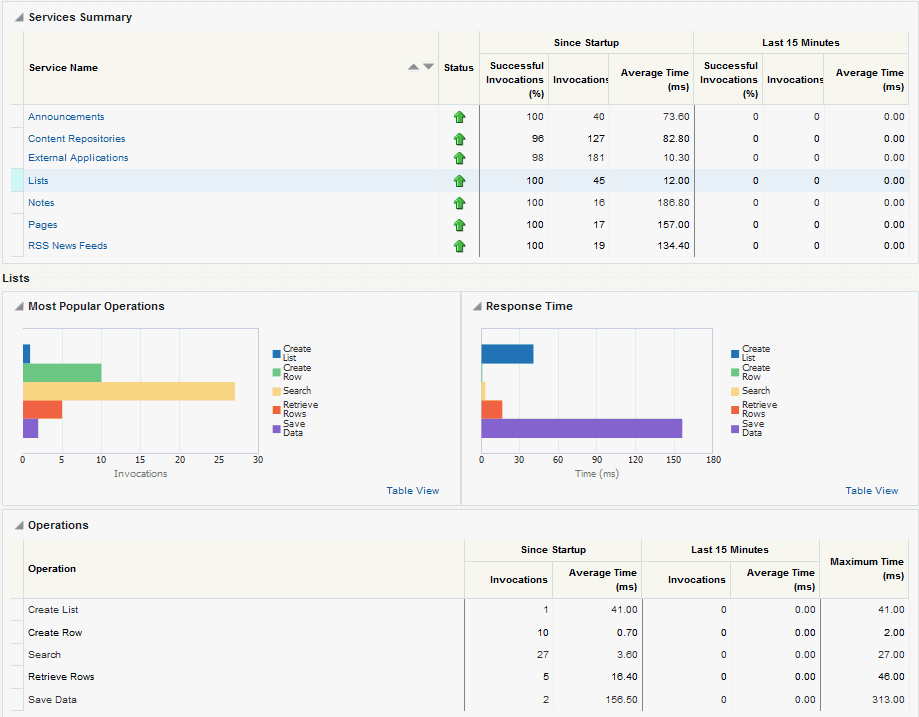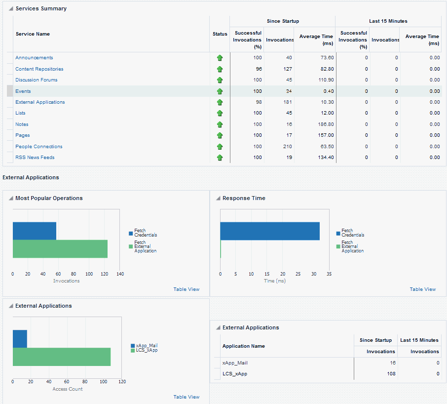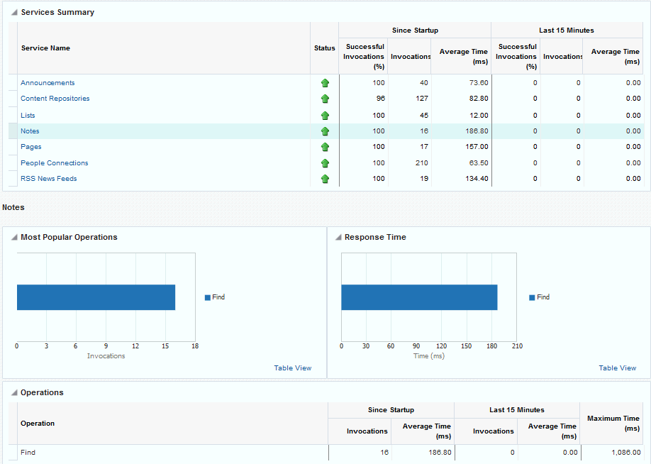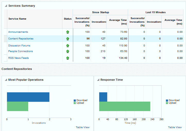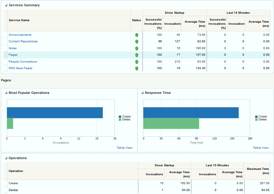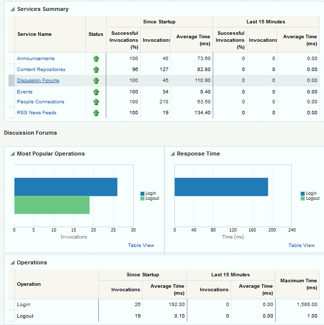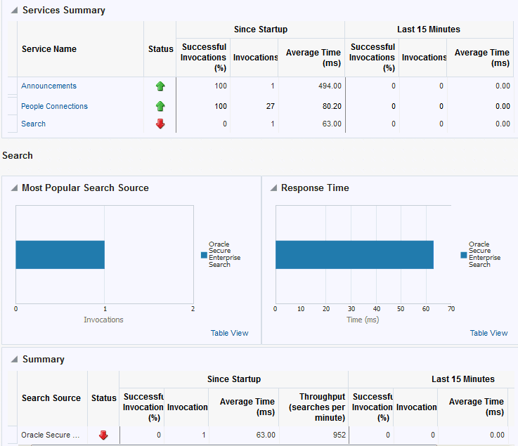 Oracle WebCenter Portal’s key performance metrics are specifically selected to help administrators quickly identity and diagnose common issues that can impact WebCenter Portal performance. You can view all key performance metric data from your application’s home page in Fusion Middleware Control.