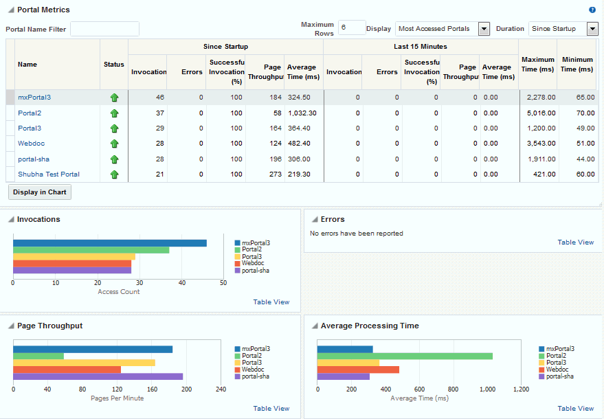 For example, consider WebCenter Portal deployed on a managed server that was started 4 hours ago. During that time, WebCenter Portal serviced 10,000 portlet requests with a total response time of 500, 000 ms. For this scenario, Since Startup metrics for portlets show: