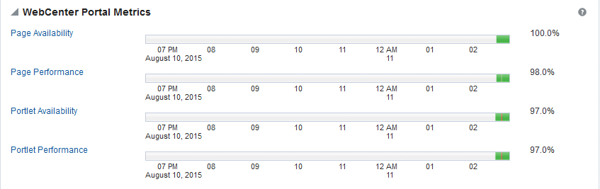 Since Startup and Recent History metrics calculate performance over a specific duration, and show aggregated metrics for that duration. In addition to these, Oracle WebCenter Portal collects and reports per-request performance information for a range of key WebCenter Portal metrics. Such metrics allow you to look at the success and response time of each request individually, without considering previous requests. Out-of-the-box, the last 100 samples are used to calculate key metric performance/availability but you can increase or decrease the sample set to suit your installation.