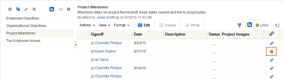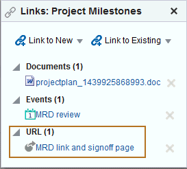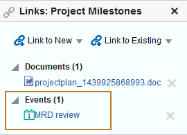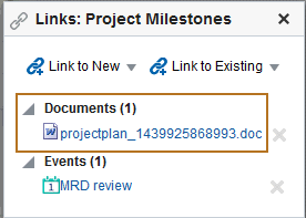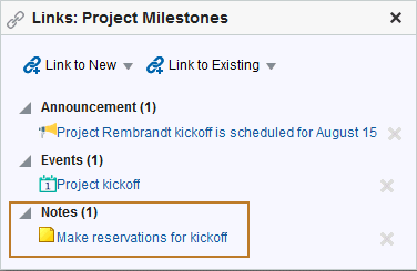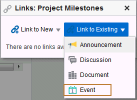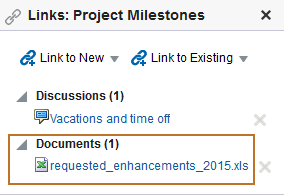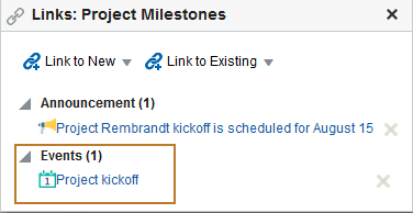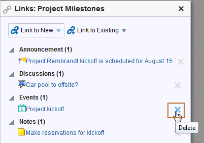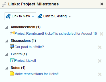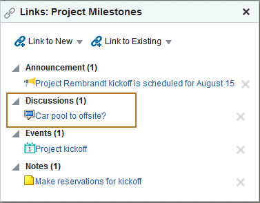 You can link relevant documents, discussions, notes, web pages, events, and announcements. When viewing the details of an event, you can link to the event’s agenda. In a list of project assignments, you can link to the functional and design specifications relevant to each assignment. In a discussion forum, you can link to a related discussion, document, web page, or WebCenter Portal page.