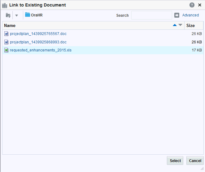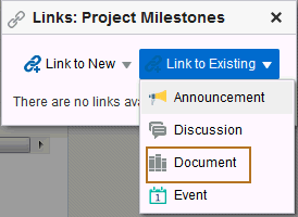Use the Link to Existing option in the Links dialog to link to existing WebCenter Portal assets, such as documents.