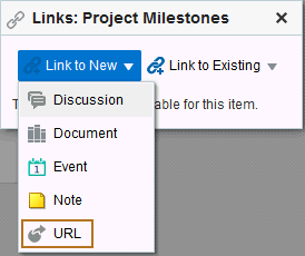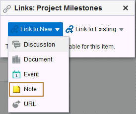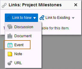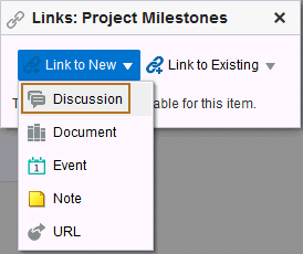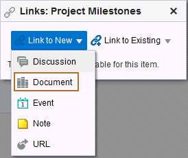 When you select Link to New, you accomplish two things at the same time: you create a new asset, and you create a link to that asset. Use the Link to New option on the Links dialog to link to a new discussion forum topic, a new document, a new event, a new note, or a web page.
