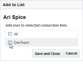 Enter a name for your list of connections, and click Save and Close to create the list and open it in the Organize Connections and Lists dialog.