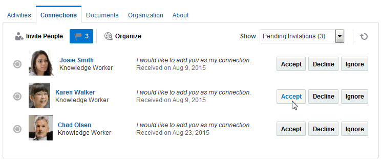 Figure 9-11 Pending Invitations View Showing Accept, Decline, and Ignore Buttons