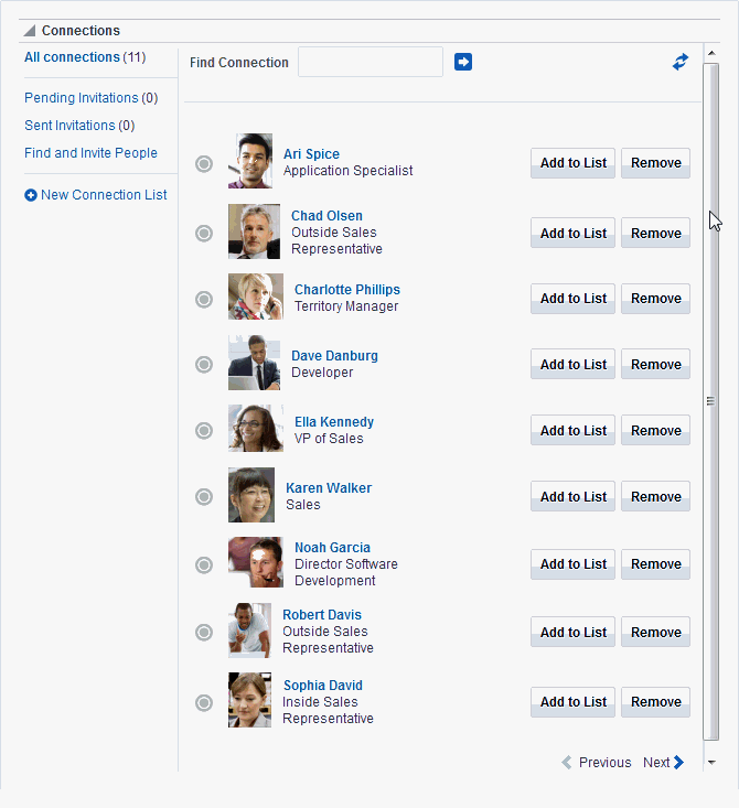 Before you begin to build your social network, your system administrator can set global application defaults that affect what all users may see and do with their own and other users’ connections. For more information, see Configuring People Connections for WebCenter Portal in Administering Oracle WebCenter Portal.