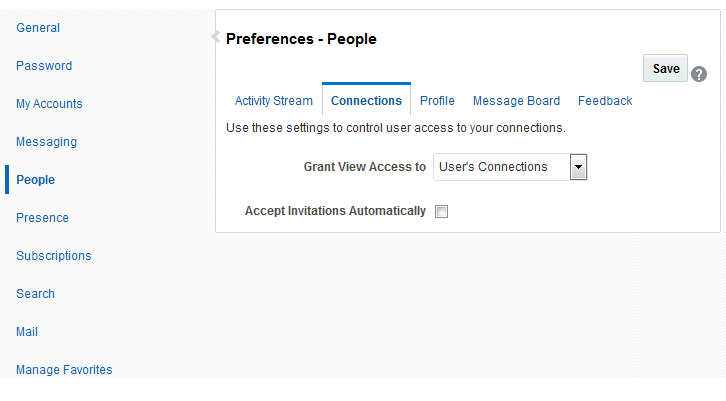 Connecting to another user potentially provides view access to that user’s personal Profile and Activity Stream, and view and post access to the user’s Message Board. The level of access you have to a connection is determined by the People Connections defaults set by your system administrator, the individual user’s People Connections preference settings, and properties set on the Connections view.