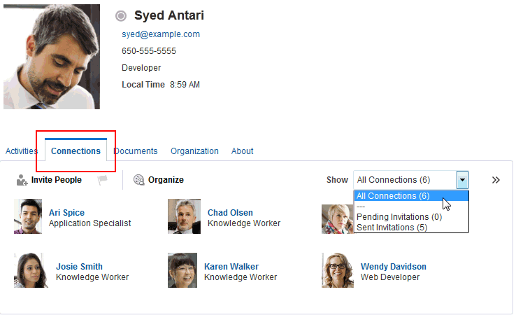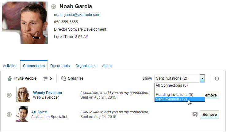 You can view the invitations you have sent and received in the Connections - Detailed View and on the Connections tab of your Profile page. This section describes the Connections tab method. It includes the following topics: