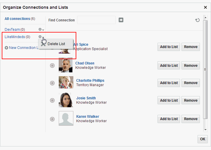 You can delete a Connections list from the Connections tab of your Profile page, the Connections viewer, and Connections - Detailed View. This section describes the Connections tab method.