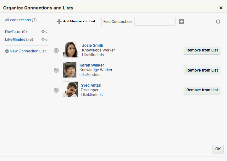 Connections provides a means of grouping your connections into lists for managing the display of your connections and your connections activities. For example: