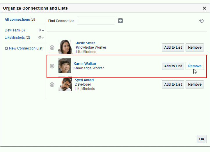 Included in the process of managing your connections is the occasional necessity of removing connections: they may leave your group or the company, or there may no longer be a compelling reason to stay connected.