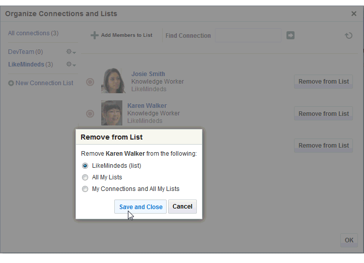 Select to remove the selected user from the current list or from all lists of which the user is a member, or select My Connections and All My Lists to remove the selected user from all lists and remove the user from your connections.