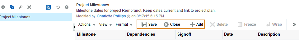 The List viewer provides easy access to all the features required for adding and revising list data, importing/exporting list data, filtering list data, obtaining a list RSS feed, and linking to other WebCenter Portal assets from the list and from a row in the list.