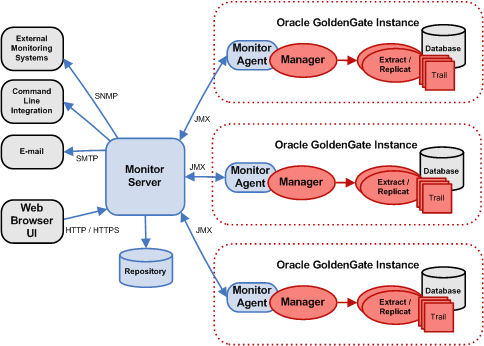 The Oracle GoldenGate Monitor Server coordinates the monitoring of multiple Oracle GoldenGate instances. The Oracle GoldenGate Monitor Server is a Java application that: